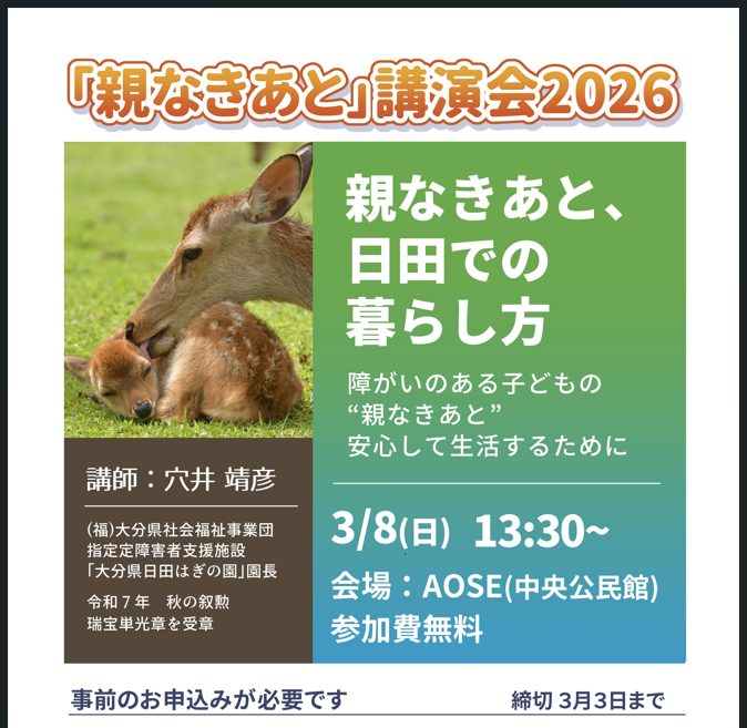 「親なきあと」講演会2026が開催されます。 日時: 2026/3/8 (日) 13:30~ 場所: AOSE(中央公民館) 「親なきあと、日田での暮らし方」をテーマに、障がいのある子どもが”親なきあと”に安心して生活す […] -